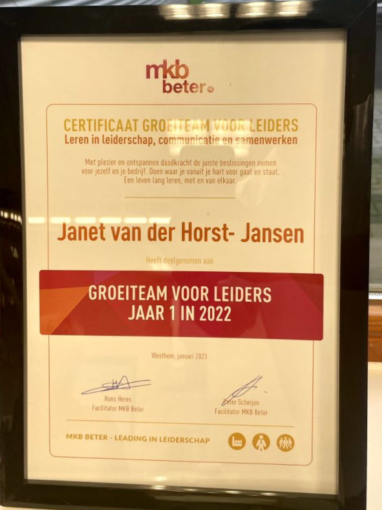 Voor Janet van der Horst- Jansen was het een mooie week, Omdat ze haar certificaat heeft mogen ontvangen van MKB Beter, elke dag 1% beter voor GroeiTeam voor leiders jaar 1. Ze heeft hier veel geleerd over leiderschap, communicatie en samenwerken. Zo probeert ze nu met plezier en ontspannen daadkracht de juiste beslissingen te nemen voor haarzelf en voor ons. Als team vonden wij het wel zo toepasselijk om haar een welverdiend bloemetje te sturen met uiteraard een leuk kaartje.????
