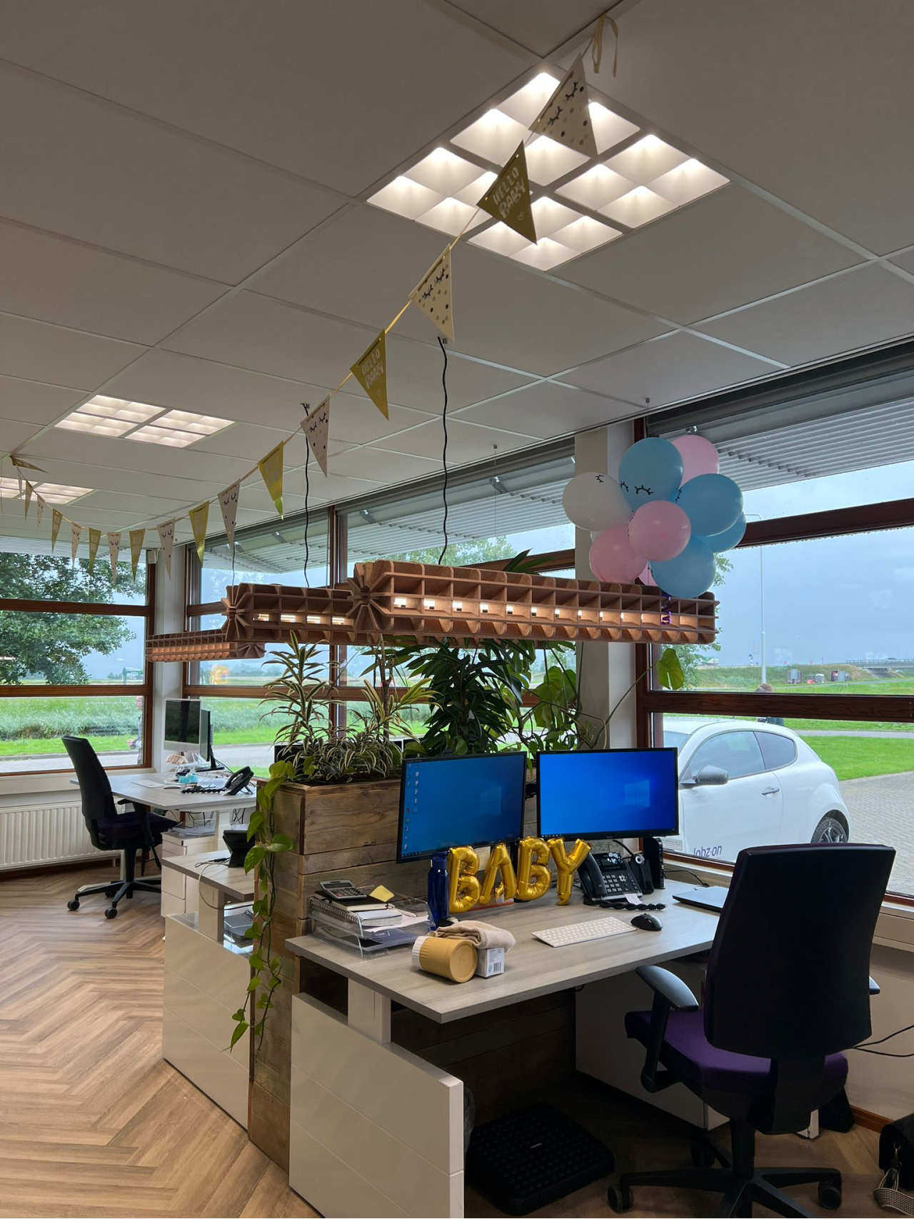 Ook is er (tijdelijk) een plekje vrij gekomen aangezien Lyda sinds vandaag met zwangerschapsverlof gaat! En dit konden we niet zomaar aan ons voorbij laten gaan. Op donderdag zijn Eelkje, Tieme en Janet bezig geweest met het versieren van haar bureau. Waar Tieme en Janet de longen uit hun lijf stonden te blazen bleek Eelkje een ware ballonnen kunstenares te zijn!