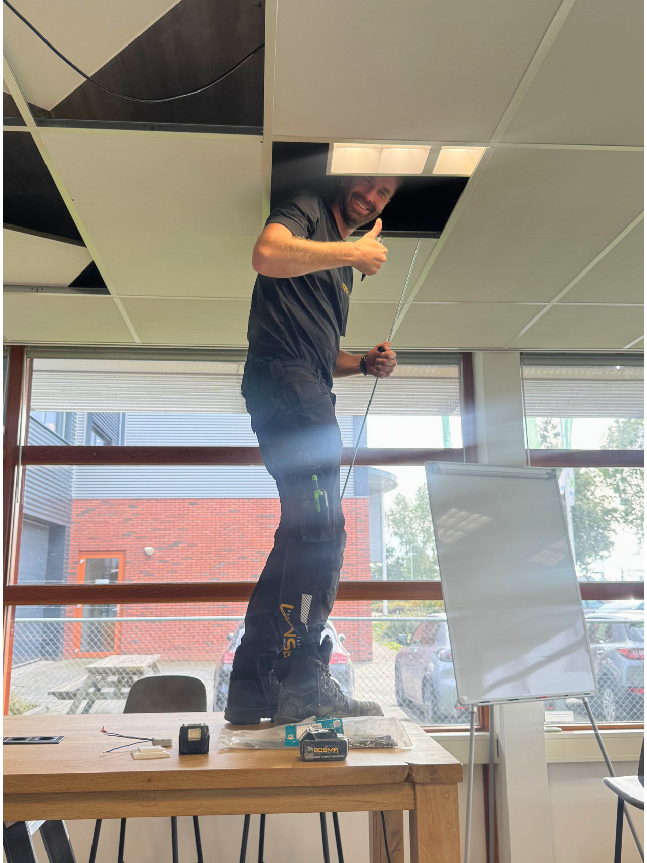Niet alleen aan de afslag voor de deur wordt hard getimmerd en gezwoegd. Ook op de benedenverdieping van ons kantoor is het een drukte van jewelste. Nieuwe bekabeling, bureaus en zit/stahoeken – een ware volksverhuizing. Gelukkig kunnen de installateurs van Bosma er nog om lachen. Extra leuk: een van hen is Wendy Jongsma, die wij ooit zelf hebben geplaatst. Nu helpt zij mee om ons pand op te knappen. Binnenkort volgt het eindresultaat!