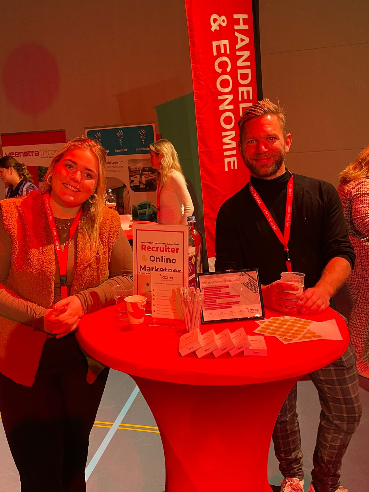 Op dinsdagmiddag was het tijd voor het jaarlijkse beroepenfeest van Onstage. In de Sneker Sporthal kwamen middelbare VMBO scholieren vanuit heel Sudwest Fryslan samen om kennis te maken met verschillende beroepsbeoefenaars. Namens Jobz-on waren Fleur en Michel aanwezig. Onder begeleiding van een zeer enthousiaste speaker en klanken die op een goed dancefeest niet zouden misstaan werden de scholieren welkom geheten op de rode loper. Daarna gingen ze in gesprek om een match te maken zodat ze tijdens de Doe-Dag een keer kunnen meelopen in het bedrijf. Na een ferme handdruk en leuke gesprekken gevoerd te hebben konden we tijdens de netwerkborrel proosten op een leuke en succesvolle dag. Er was veel animo om bij ons een kijkje te nemen tijdens de Doe-Dag ????.